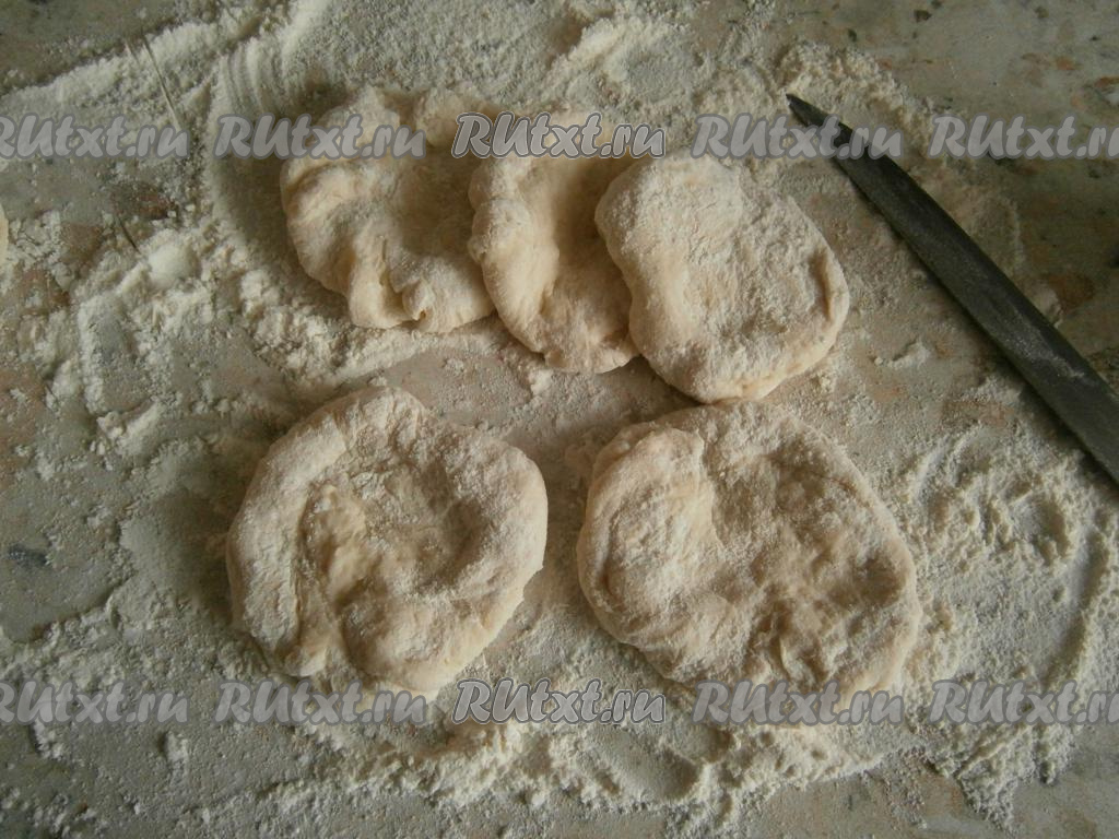 Подошедшее тесто обмять, посыпав стол небольшим количеством муки, затем разделить его на кусочки весом около 80 грамм.