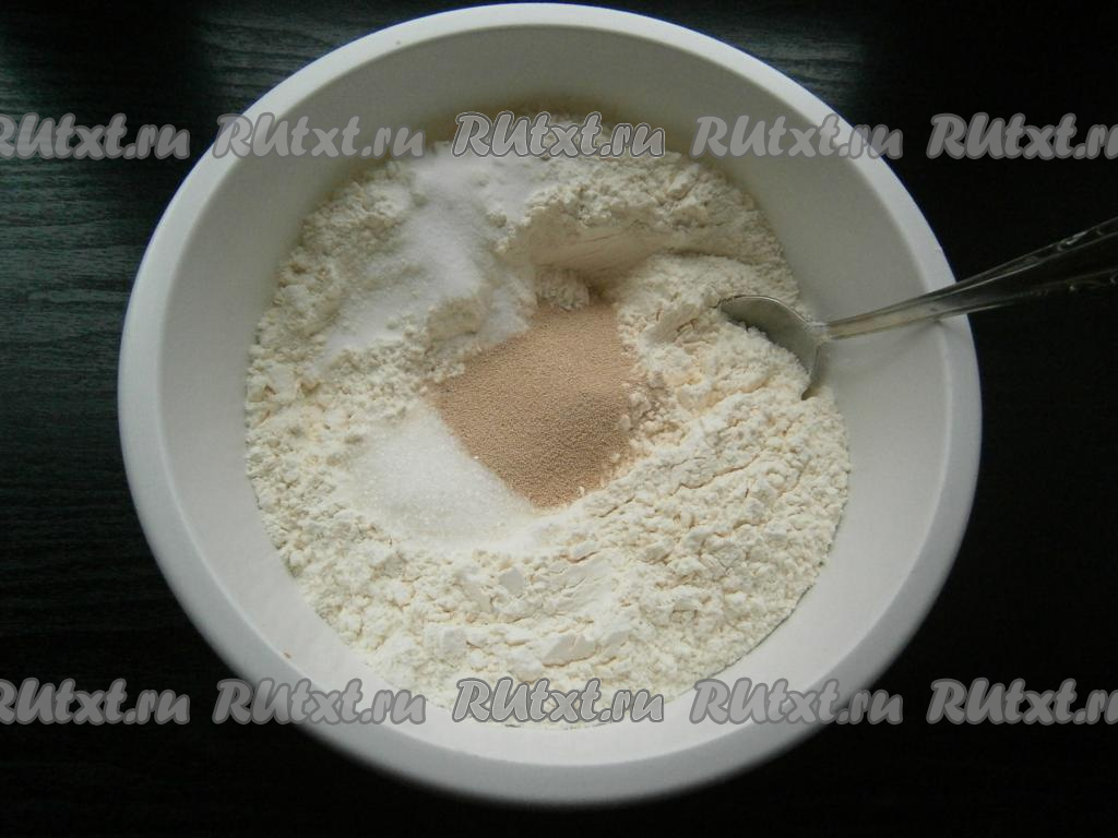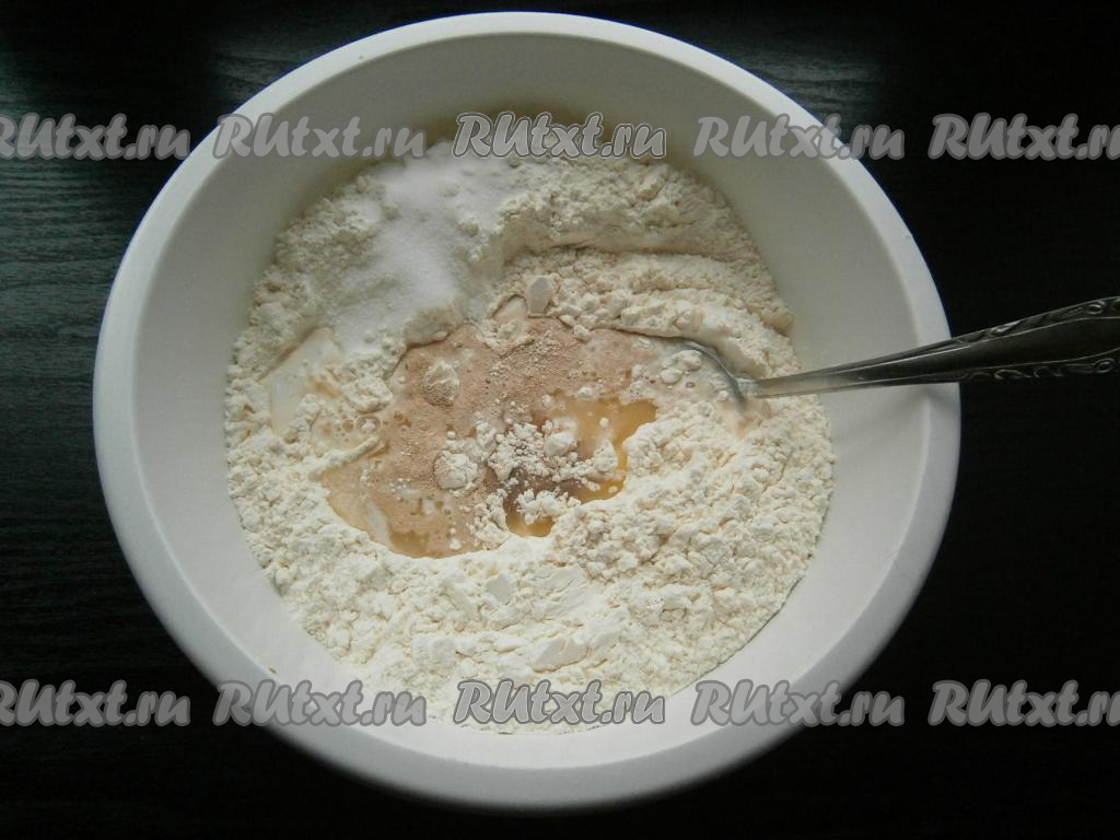 Вливая частями смесь молока и воды в смесь муки и дрожжей, замешивать ложкой тесто, также добавив сюда еще и растительное рафинированное масло.