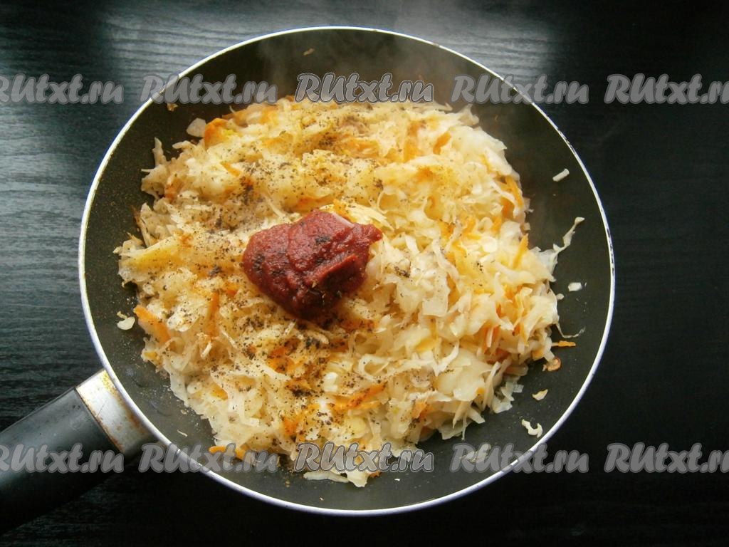 Жарить капусту на небольшом огне, перемешивая, минут 5-6, чтобы она немного обмякла. Затем добавить томатную пасту, специи, сахар и черный молотый перец, влить воду. Тщательно перемешать.
