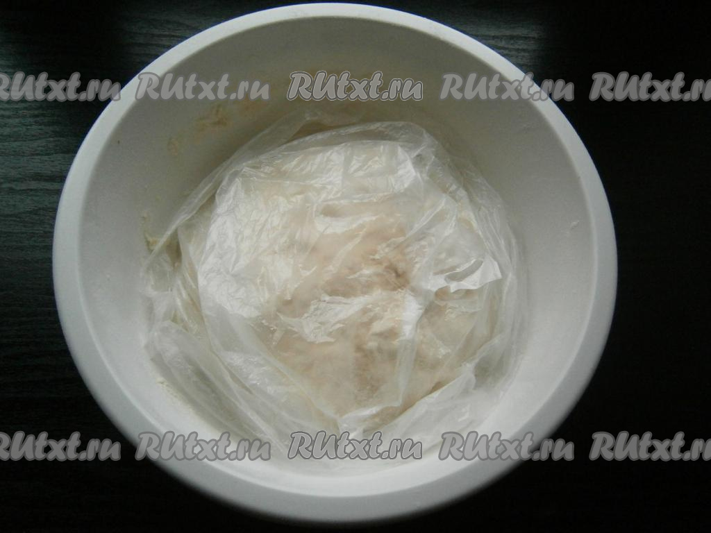 Накрыть тесто целлофановым пакетом или пленкой и оставить на 2-2,5 часа. Это тесто можно оставлять и в теплом, и в прохладном месте.