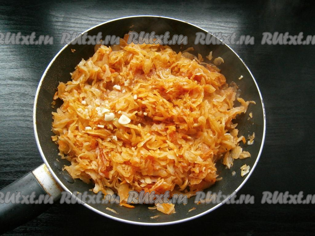 Тушить капусту на небольшом огне, периодически ее перемешивая, около 10 минут. В конце добавить измельченный очищенный чеснок, перемешать.