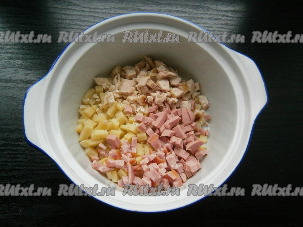 Картофель очистить и нарезать небольшими кубиками. Колбасу, ветчину и курицу тоже нарезать кубиками и выложить к картошке.
