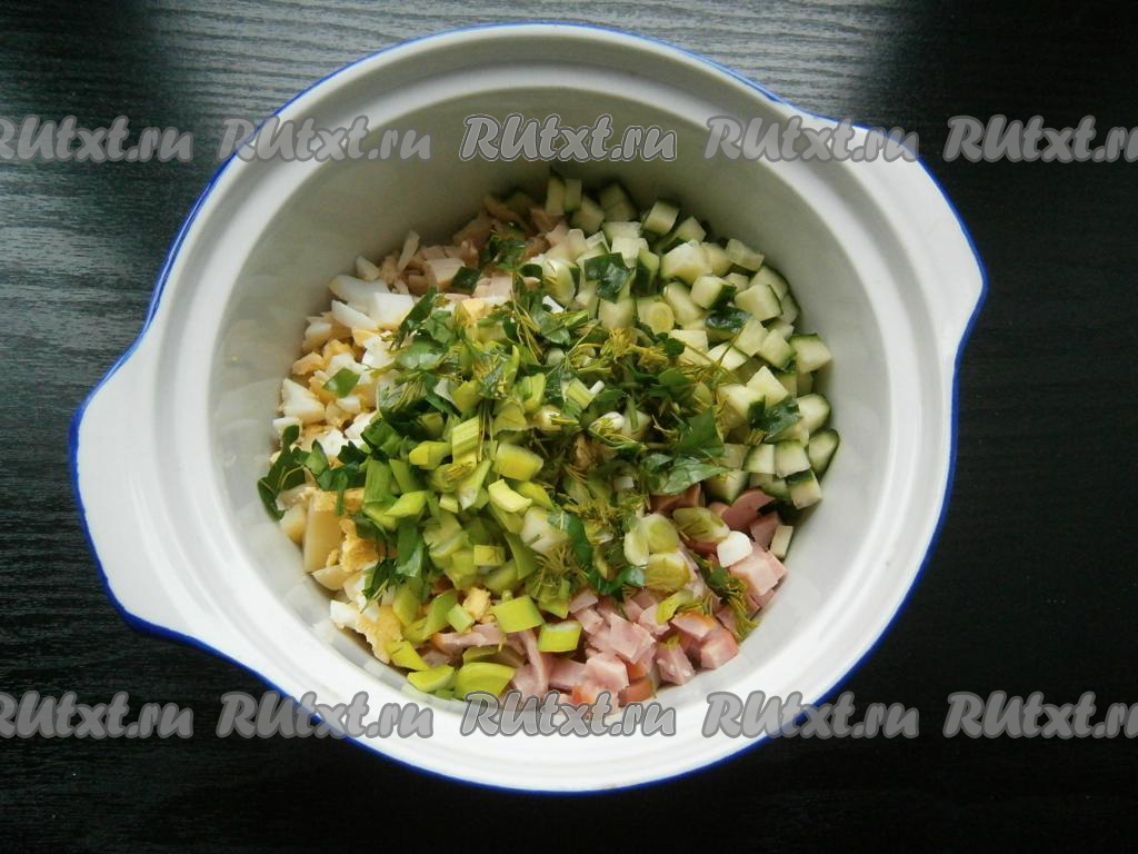 Тщательно перемешать. Поместить окрошку в холодильник часа на 2.