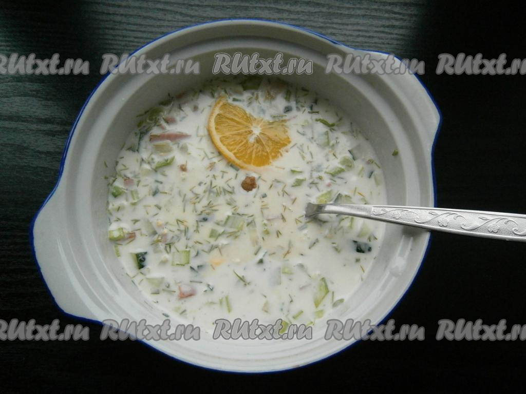 Освежающую и очень вкусную окрошку, приготовленную на сметане и воде, разлить по тарелкам и подать к столу.
