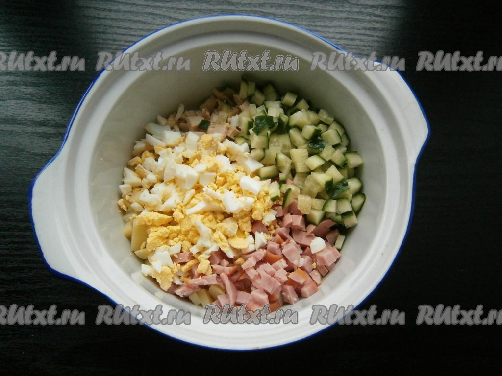 Сюда же добавить нарезанные вареные яйца и нарезанный кубиками свежий огурец.