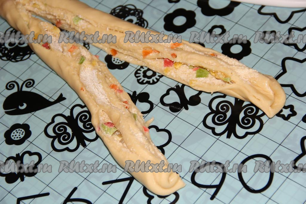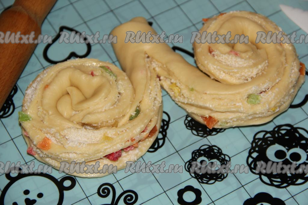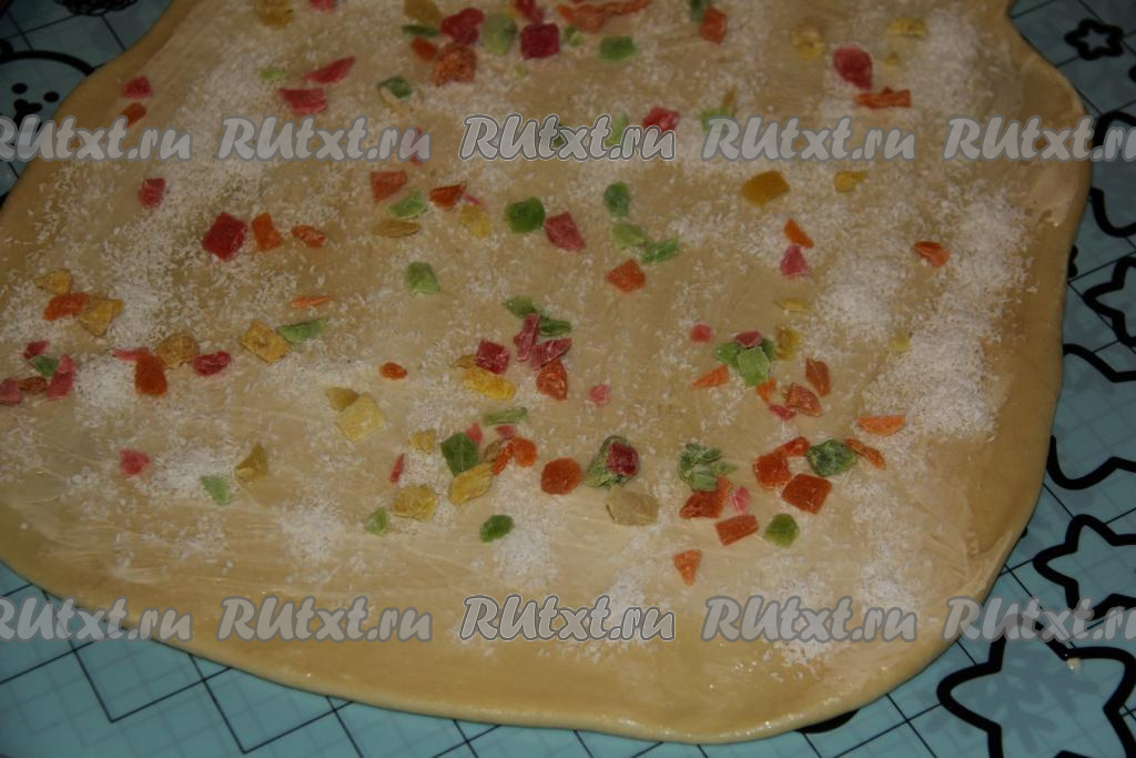 Тесто, посыпанное цукатами и кокосовой стружкой, свернуть в плотный рулет. В результате получатся 3 рулета.