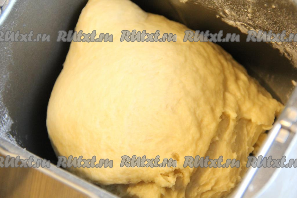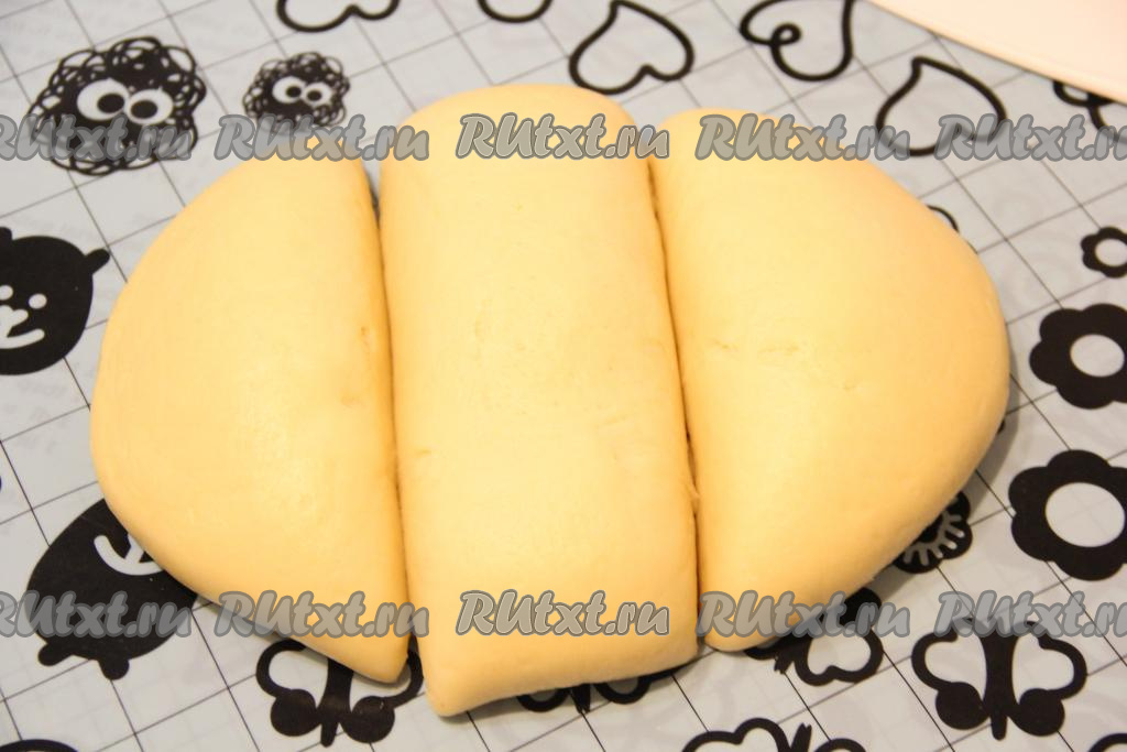 Обмять тесто, замешанное в хлебопечке или вручную, и дать подняться второй раз. Ещё раз обмять готовое тесто и разделить его на 3 части.