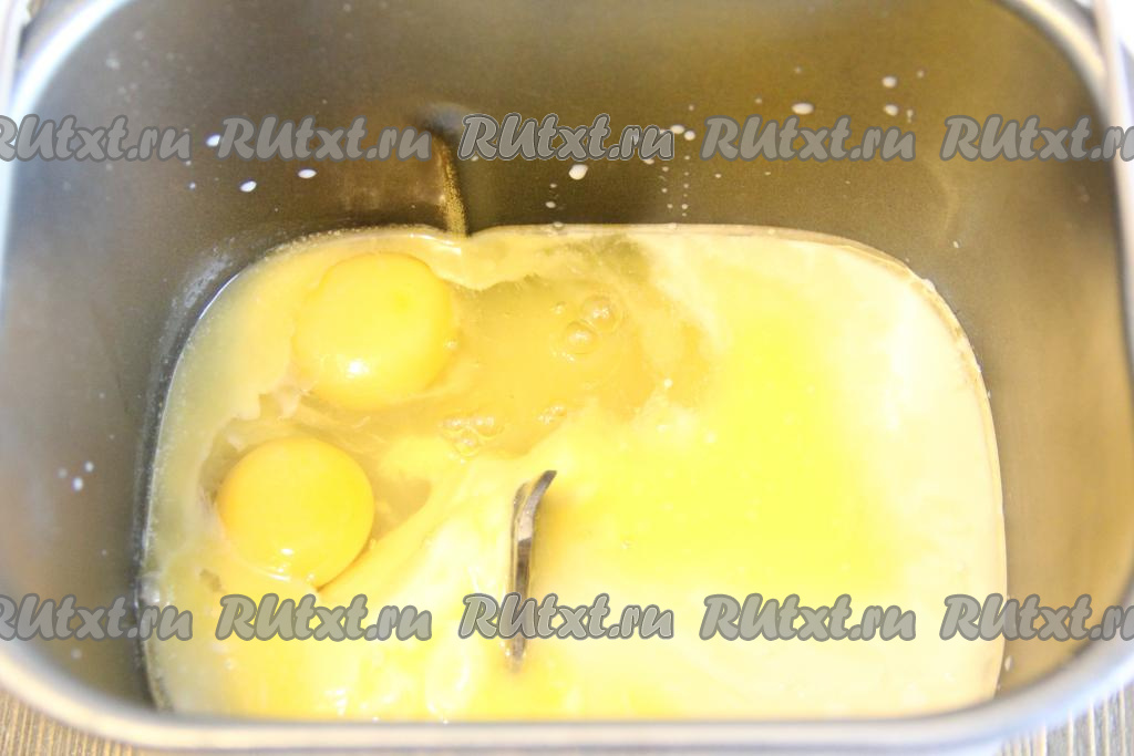 Замесить тесто для кулича можно вручную или воспользовавшись помощью хлебопечки. Для того чтобы замесить тесто в хлебопечке, нужно оставшееся тёплое молоко, ожившие дрожжи, яйца, растительное масло и растопленное не горячее сливочное масло отправить в ведёрко хлебопечки. Всыпать сахар и ванильный сахар.