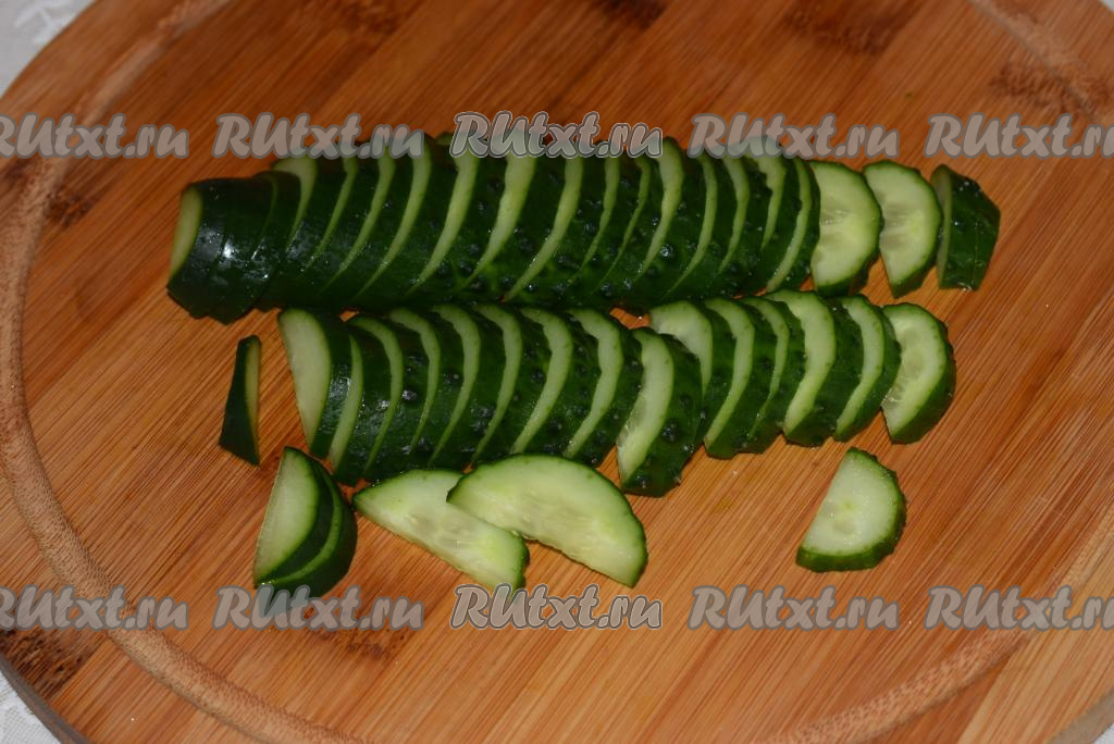 Огурцы нарезаем пополам вдоль и затем - поперек на тоненькие полуколечки.