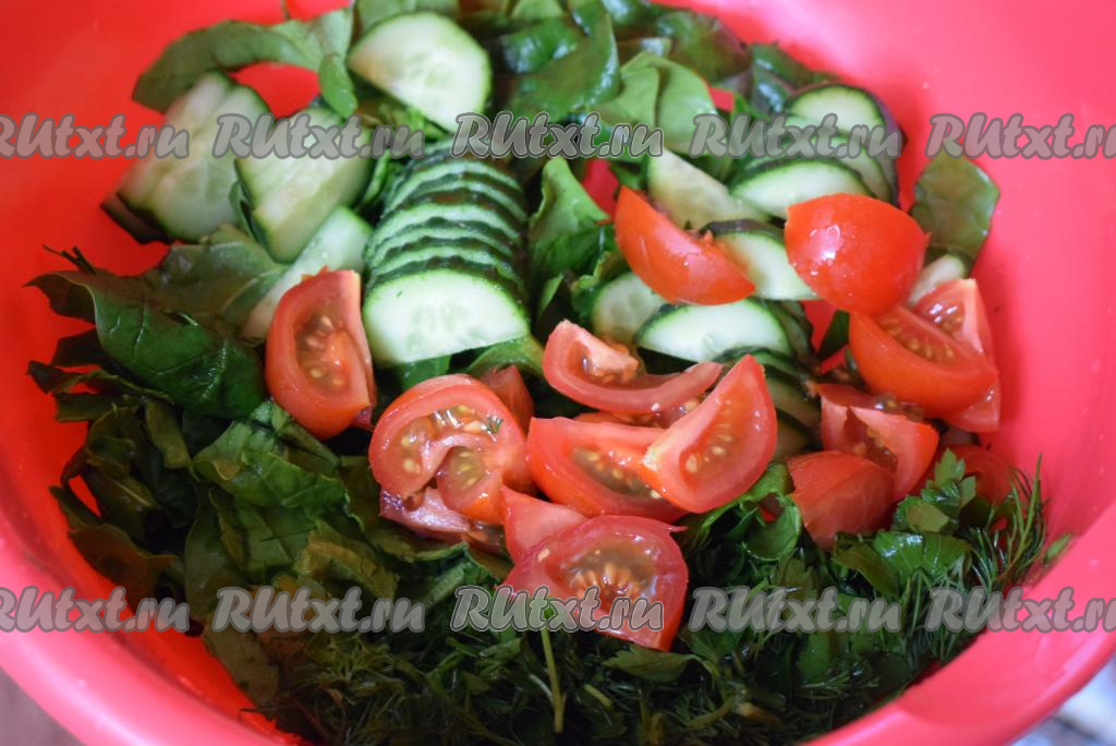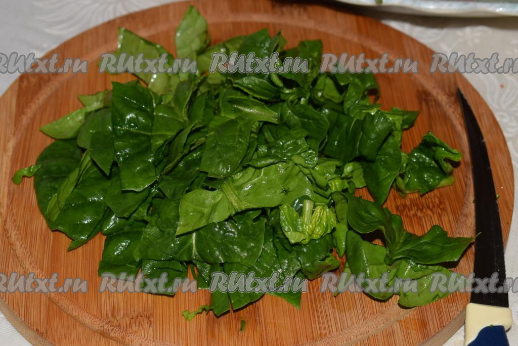 Шпинат нарезаем на крупные полосы (если нет шпината, то можете приготовить этот овощной салат и без него).
