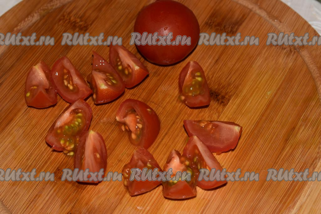 Помидоры (у меня черри) нарезаем на дольки.