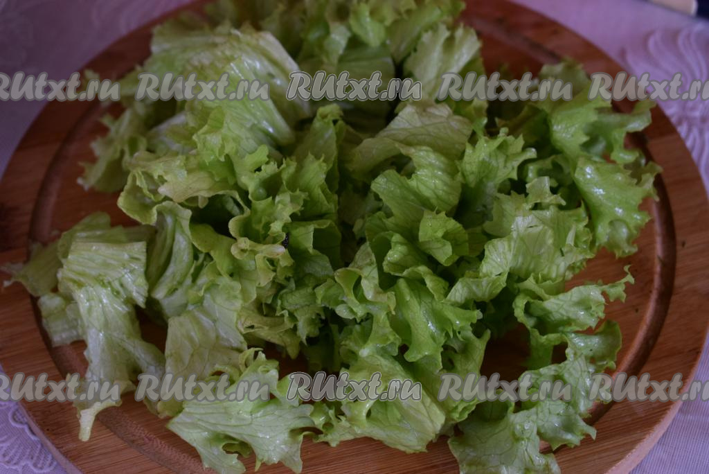 Листья салата нарезаем на крупные полоски или же рвем руками.