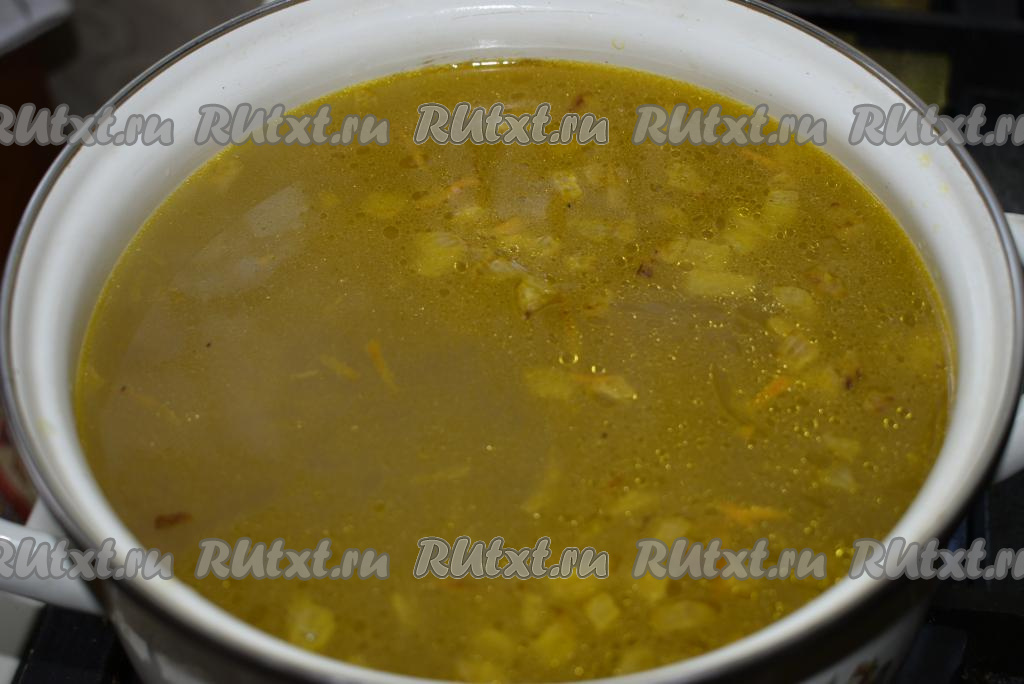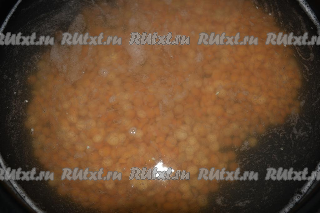 Когда картошка станет мягкой, добавить в постный гороховый суп обжаренные лук с морковью, посолить по вкусу, довести до кипения.