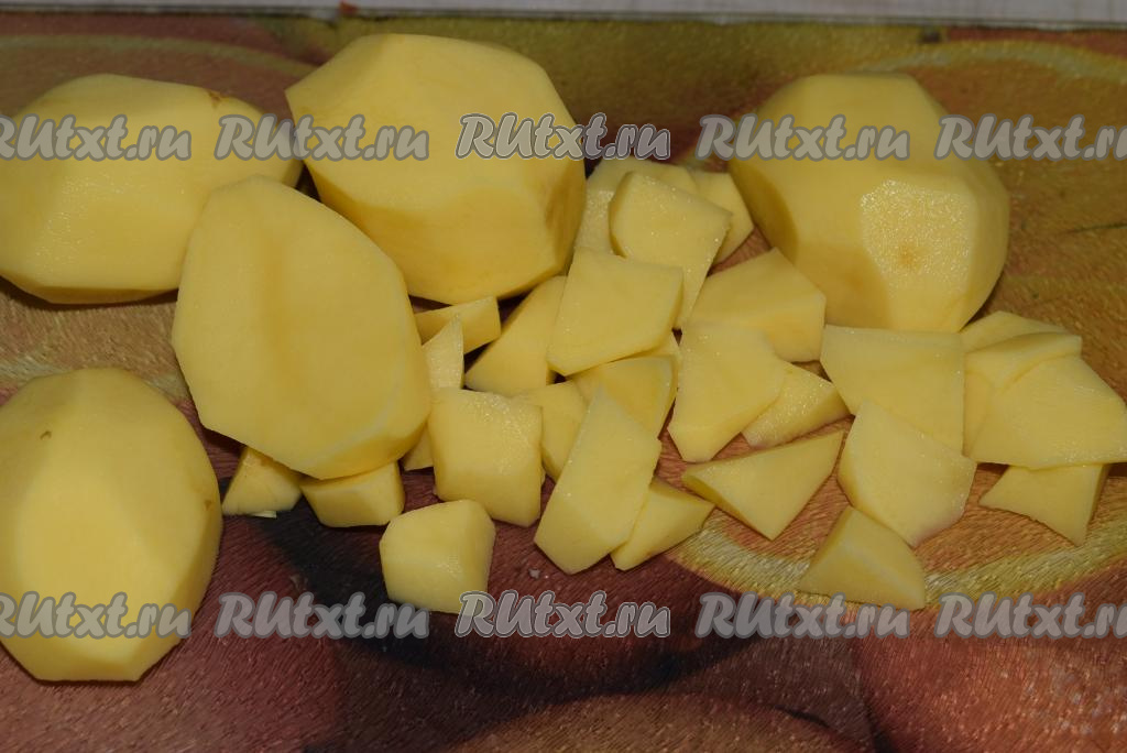 Картофель очистить, нарезать на дольки среднего размера. Когда горох сварится (станет мягким), добавить в кастрюлю нарезанную картошку и варить до готовности картофеля (15-20 минут).