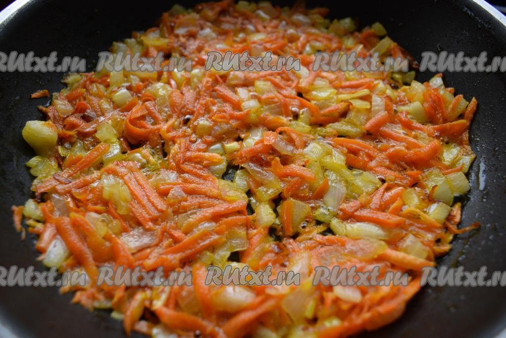Дальше очистить лук и морковь. Лук нарезать на мелкие кубики, морковь натереть на крупной тёрке. На сковороду налить растительное масло и добавить лук с морковью. Обжарить овощи, помешивая, до прозрачности на слабом огне.