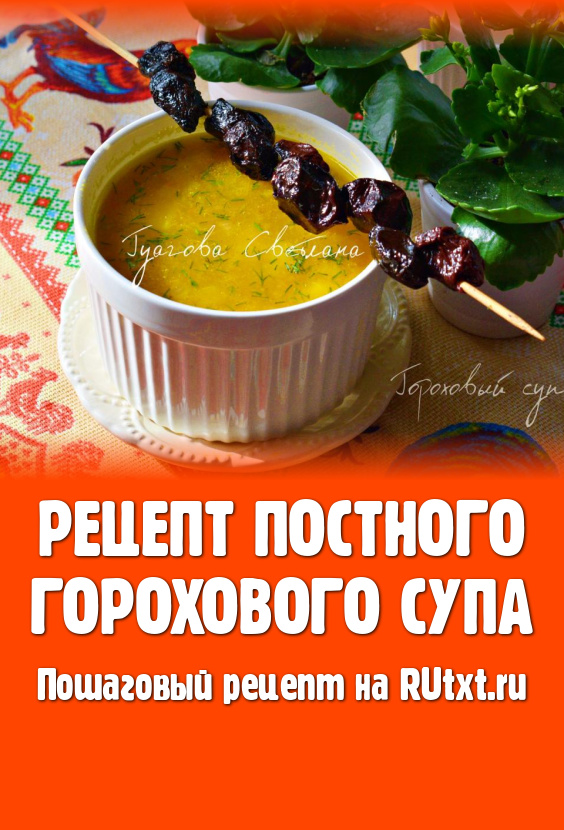Постный гороховый суп, приготовленный по этому рецепту, - это вкусное и сытное первое блюдо. Такой супчик отлично разнообразит меню. Его можно готовить не только в дни Поста. Лично я и в повседневном меню отдаю предпочтение постному гороховому супу, его вкус мне нравится гораздо больше, чем вкус горохового супа, сваренного на копченостях. Подать его можно с копчеными оливками или с различными сухариками, что придаст интересные оттенки этому прекрасному блюду, попробуйте!