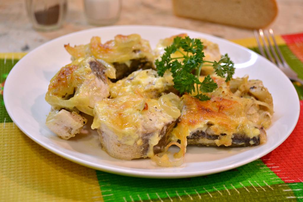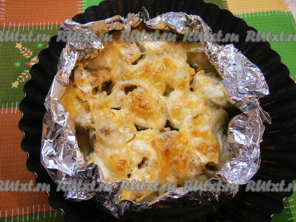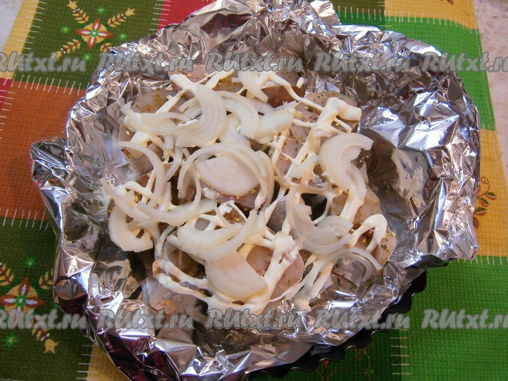Рыбу смазать майонезом и разместить на ней нарезанный полукольцами очищенный репчатый лук.