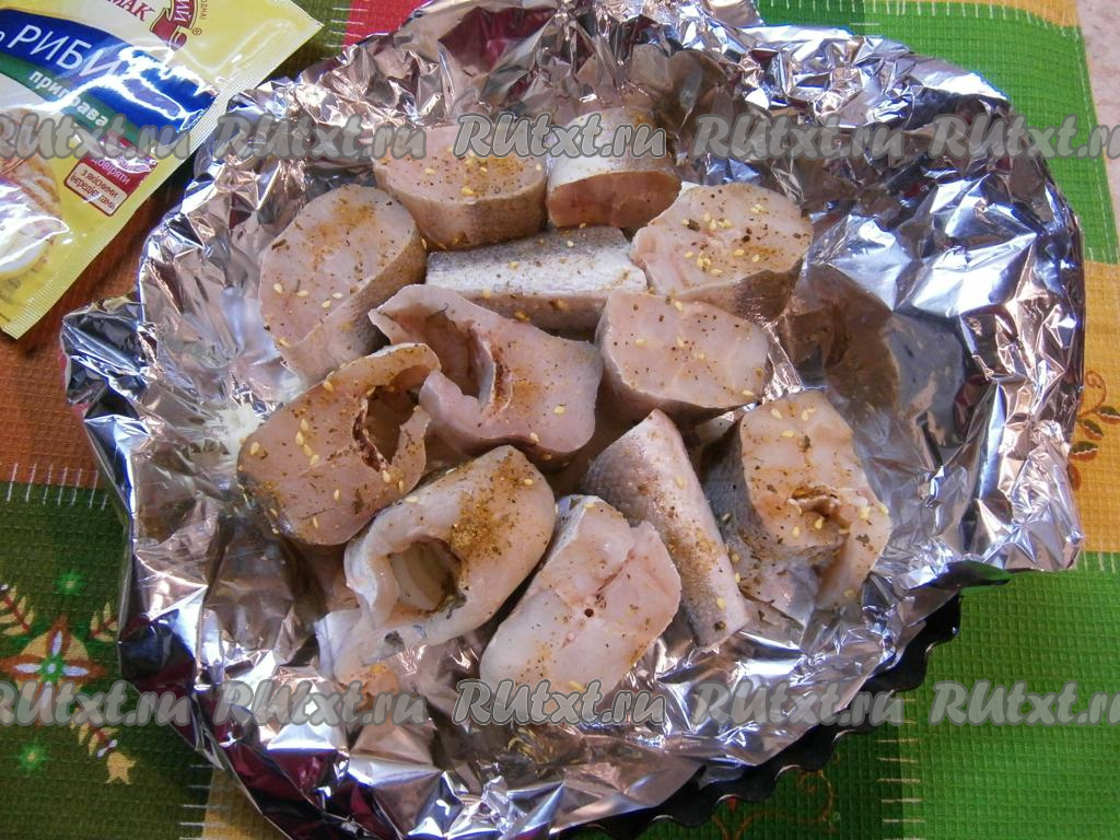 Лист фольги сложить вдвое и поместить его в небольшую форму для запекания. Рыбу посолить и посыпать приправой, поместить ее на фольгу.