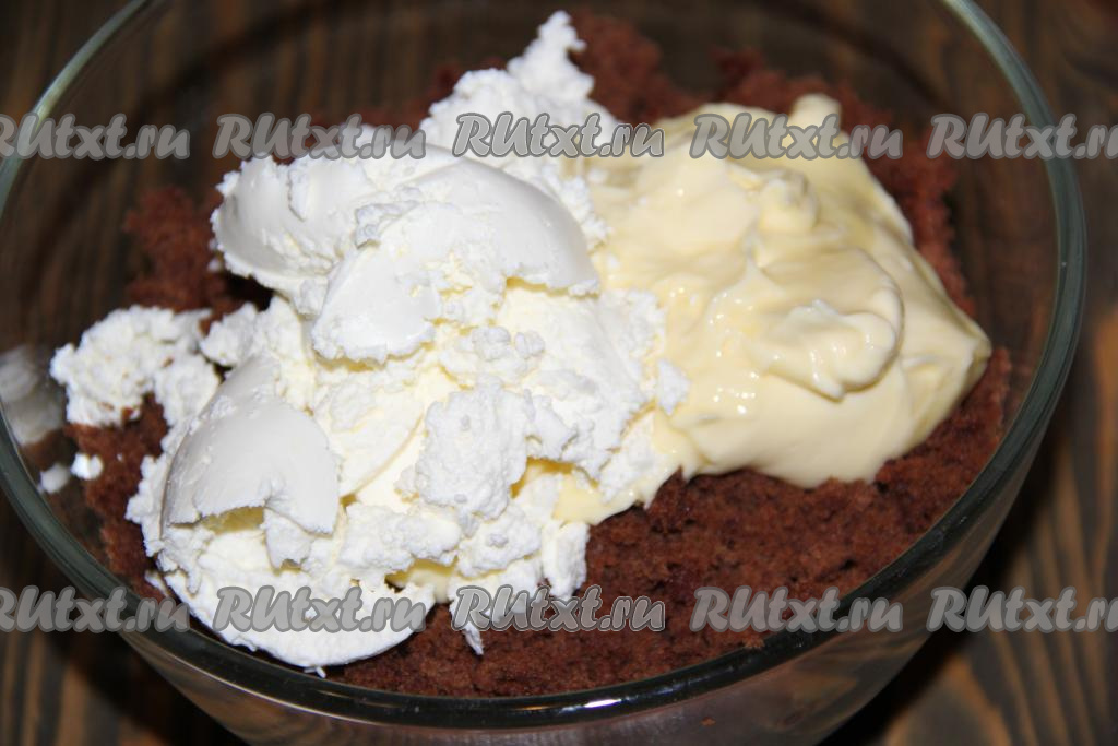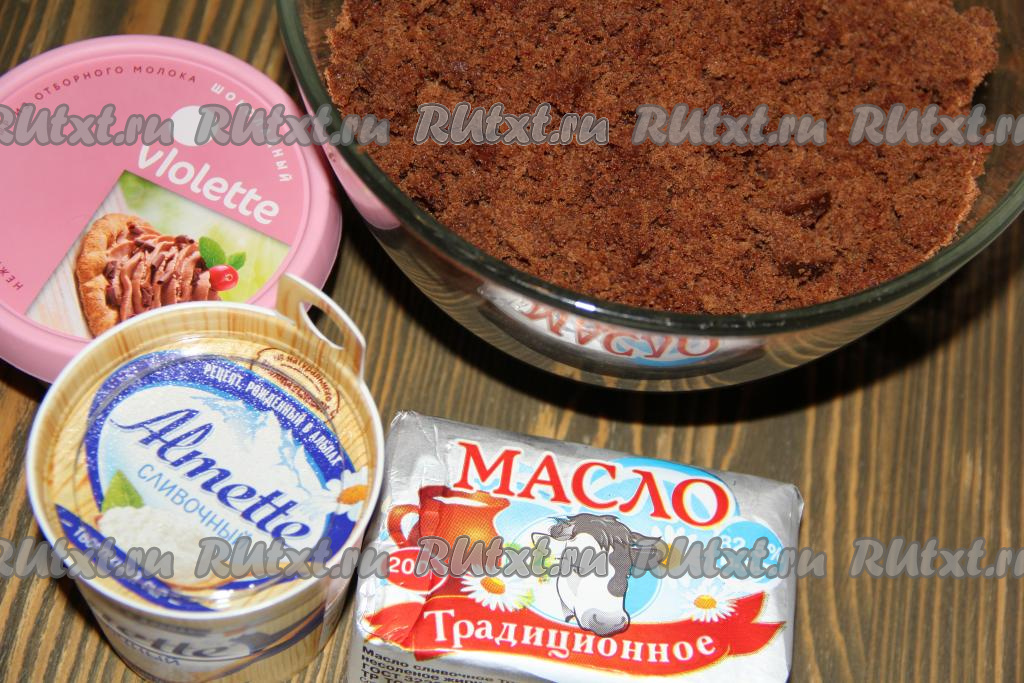 Добавить в 450 грамм бисквитной крошки масло и творожный сыр. По желанию, можно всыпать сахарную пудру или дроблёные орехи.