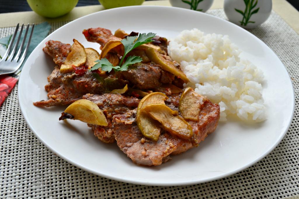 Вкусная и сочная свинина, запеченная с яблоками в духовке, готова! Можно сразу же подать к столу.