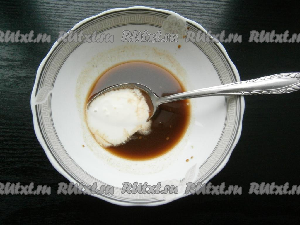 Приготовить соус: к соевому соусу добавить жидкий мед и горчицу, перемешать.