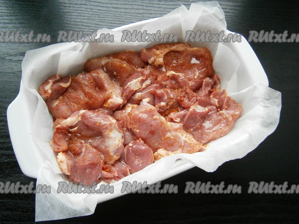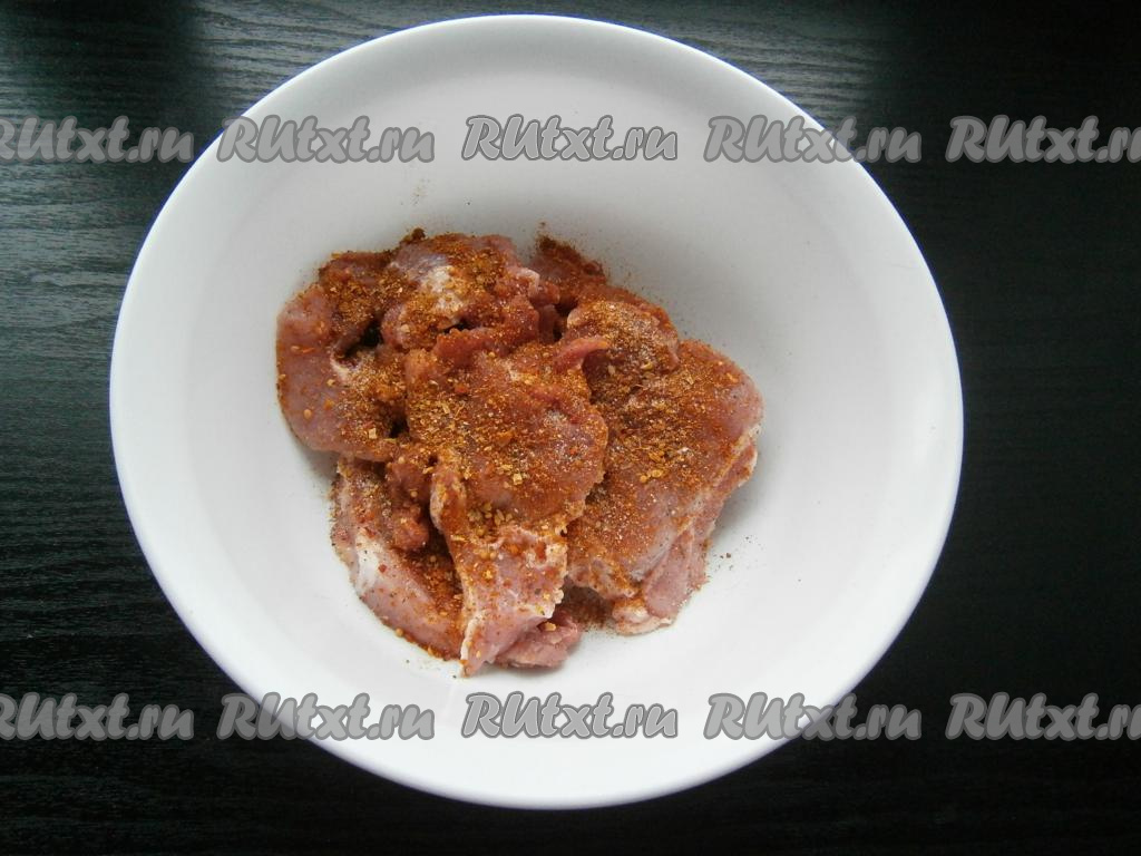 Кусочки свинины посолить и посыпать специями, перемешать.