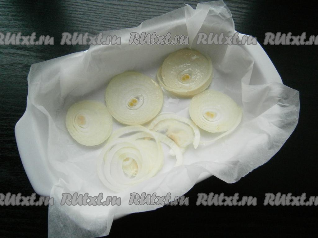 Небольшую форму для запекания (размер формы по диагонали 19-20 см) застелить пергаментом, выложить в форму нарезанный кольцами очищенный лук.