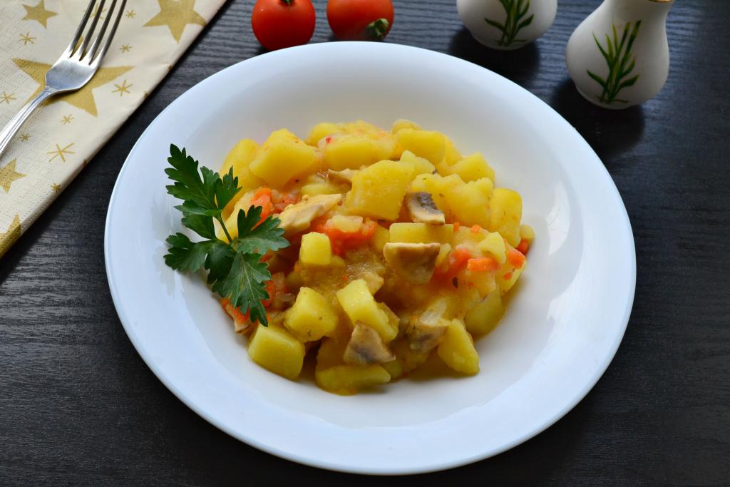 Картошка, тушеная с шампиньонами в мультиварке, получается очень вкусной, раскладываем по тарелкам и подаём к столу.