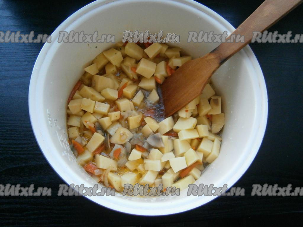 Влить горячий бульон (или воду), перемешать, выставить режим "Тушение" на 1 час, крышку мультиварки закрыть. За 10 минут до готовности добавить к картошке с шампиньонами измельченный чеснок.