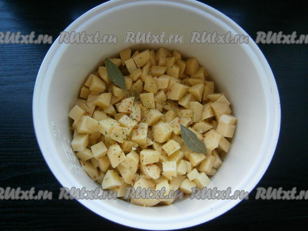 В чашу выложить нарезанный кубиками очищенный картофель, добавить соль, специи, лавровые листья.