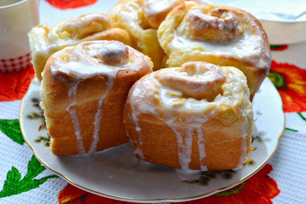 Предлагаю вам рецепт булочек с яблоками из дрожжевого теста. Эта выпечка - одна из любимых в моей семье, такие булочки любят все без исключения. Булки получаются пышными, ароматными, очень вкусными, сладкими и мягкими. Яблоки лучше использовать сладенькие. Сверху булочки я полила белковой глазурью, можно использовать любую глазурь, также можно смазать растопленным шоколадом или просто посыпать сахарной пудрой. Попробуйте, нежнейшая и вкуснейшая выпечка!
