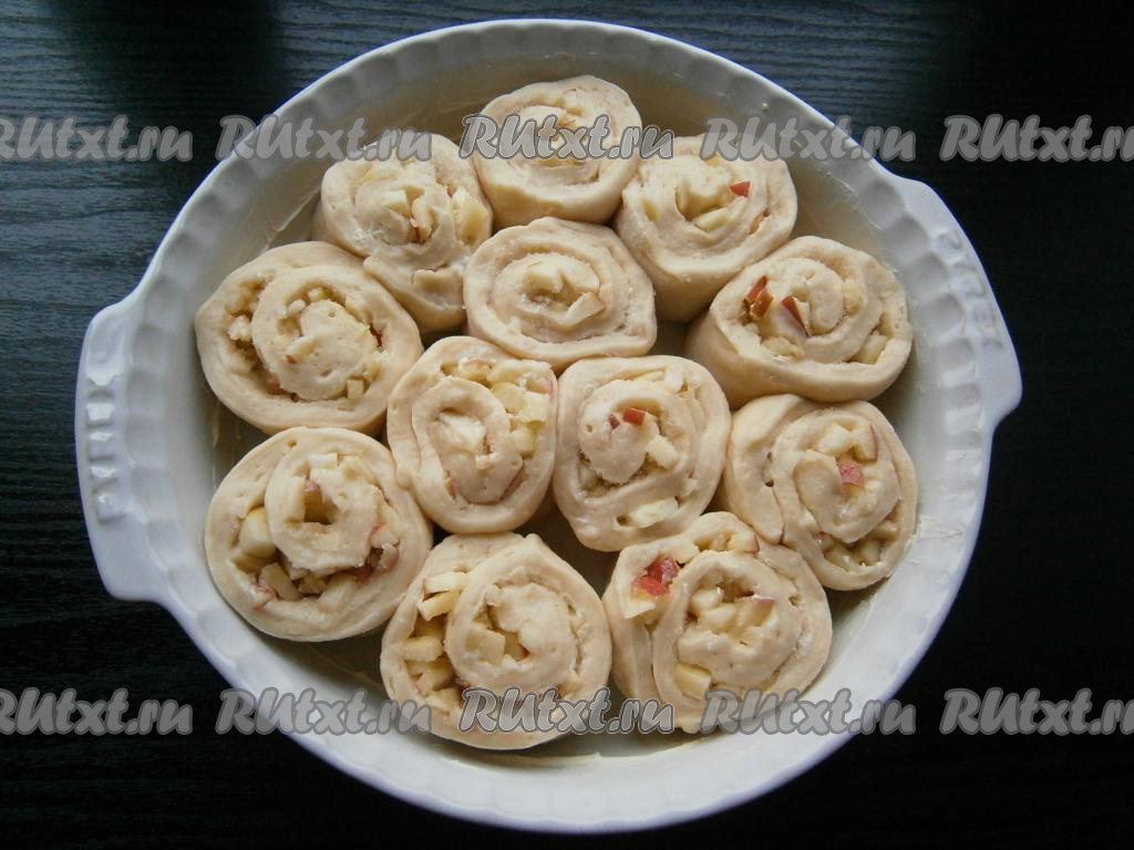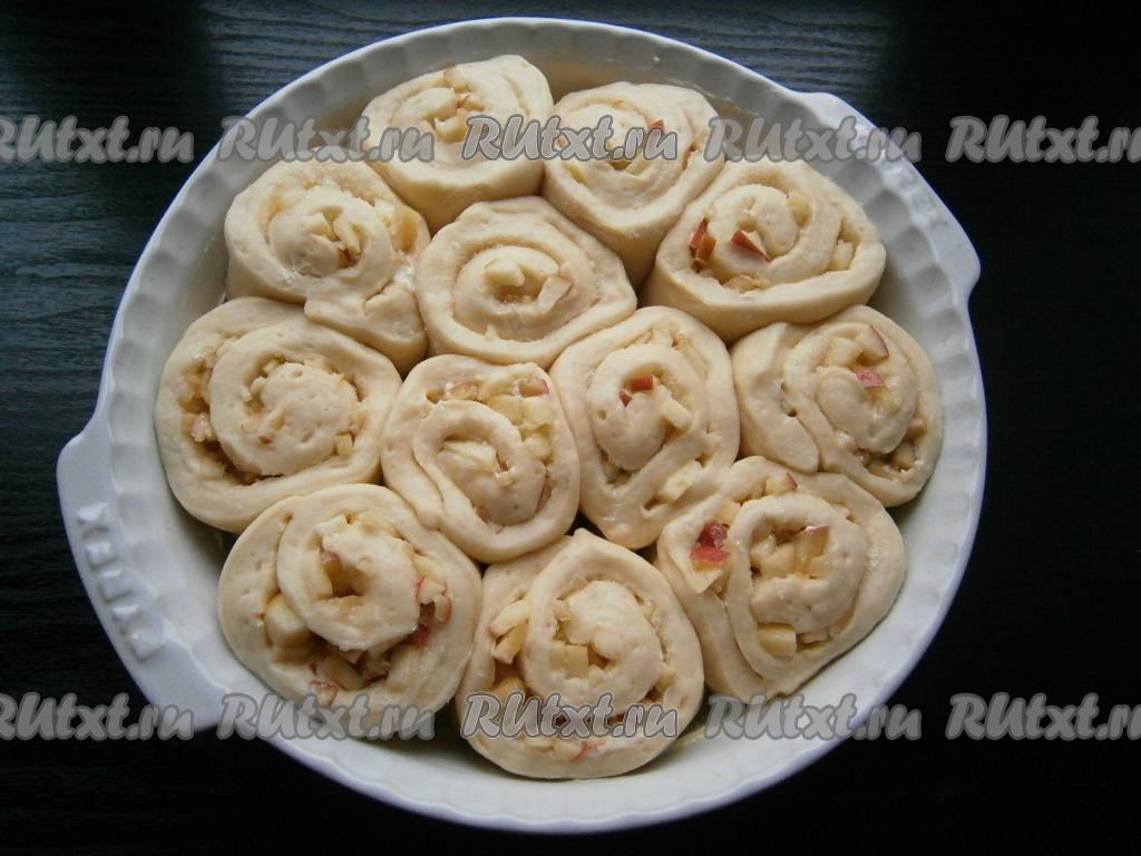 Прикрыть форму пленкой и оставить дрожжевые булочки с яблочной начинкой на 30 минут в теплом месте для расстойки. Выпекать в разогретой духовке 30-35 минут (до румяности) при температуре 180 градусов.
