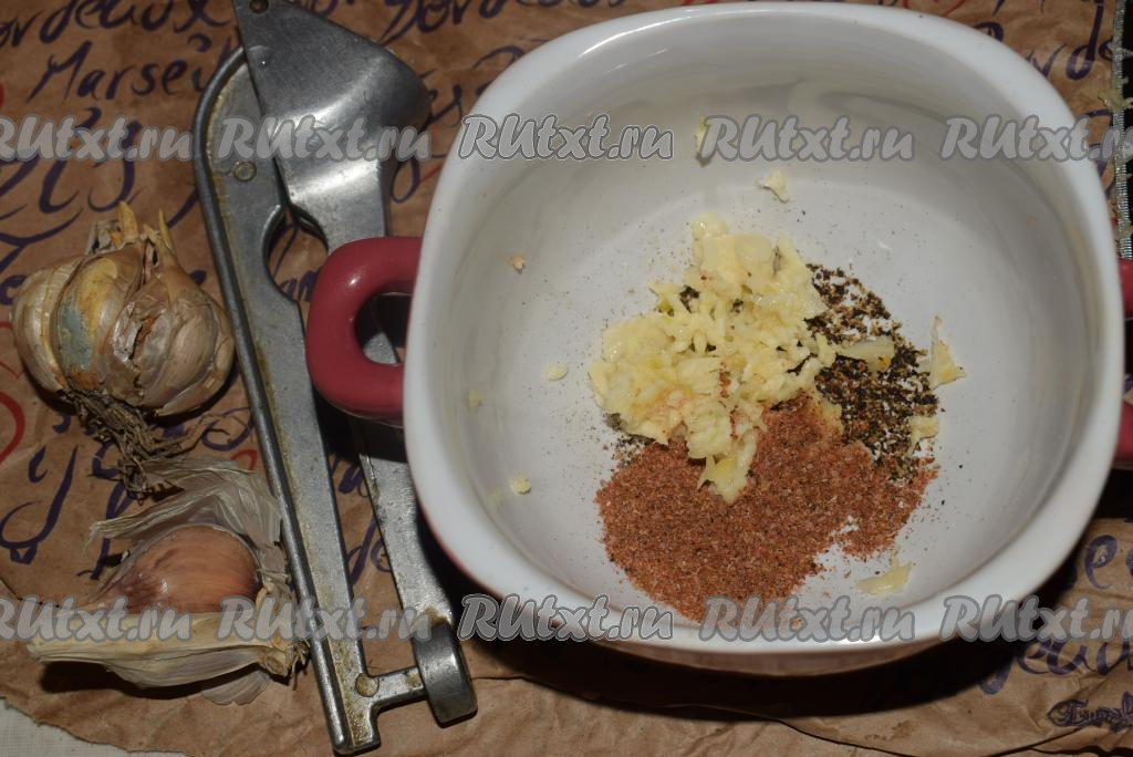 Далее для приготовления заправки возьмем миску, пригодную для использования в микроволновке. В миску насыпаем специи для корейской моркови, черный молотый перец, кориандр и добавляем чеснок, пропущенный через пресс.