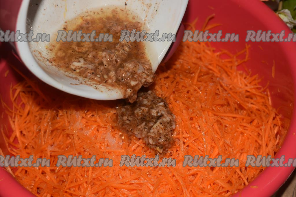 Добавляем к натёртой моркови сахар и соль, перемешиваем. Морковь по сладости бывает разной, поэтому, возможно, потребуется добавить еще немного соли или сахара по вкусу, но делать это следует уже в самом конце приготовления.