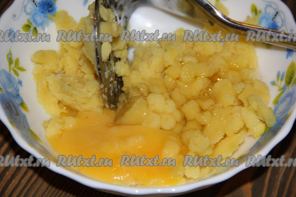 Для приготовления клёцек: картофель размять толкушкой, добавить яйцо и соль.