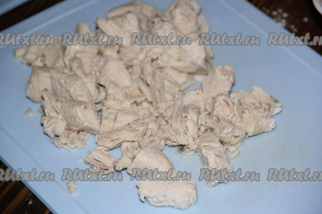 Мясо выложить в кастрюлю, залить водой, поставить на огонь, после закипания уменьшить огонь и варить до готовности (куриную грудку варить около 30-40 минут). Затем мясо вынуть, отделить от костей и порвать на волокна или нарезать.