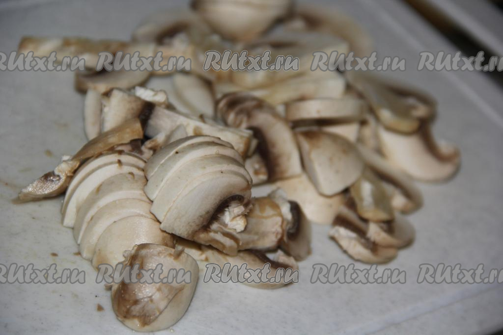 Шампиньоны промыть и нарезать на пластины.