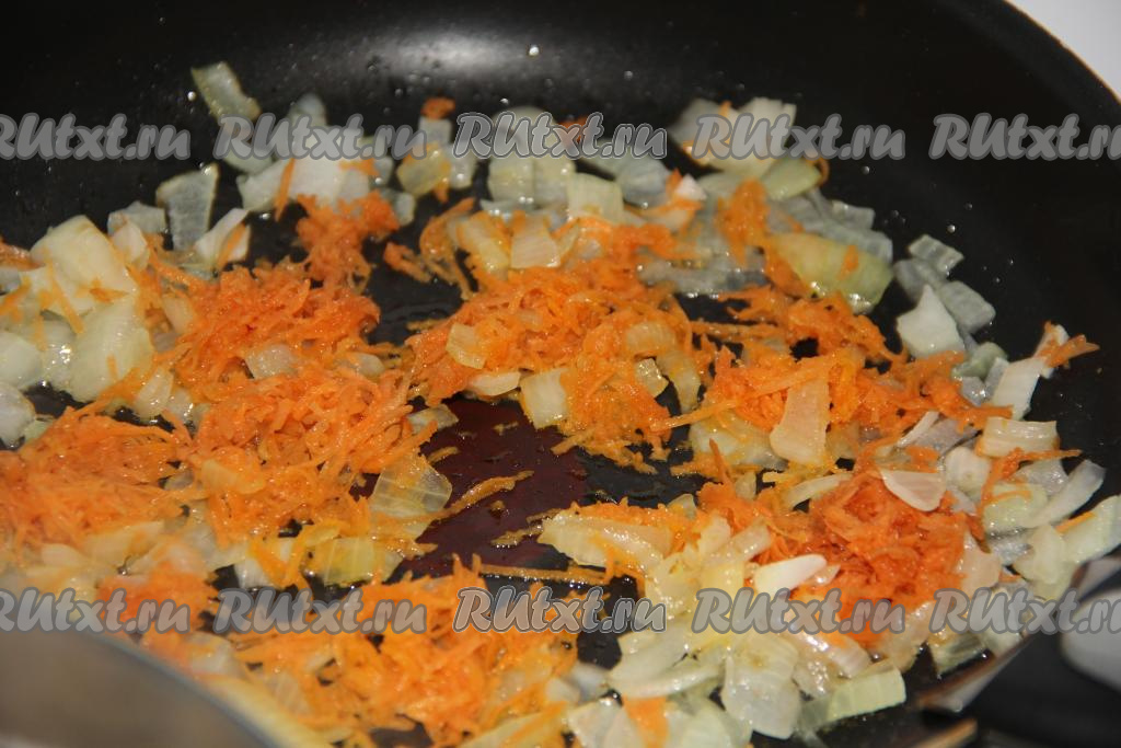 Добавить морковь в сковороду и обжарить с луком пару минут, иногда перемешивая.