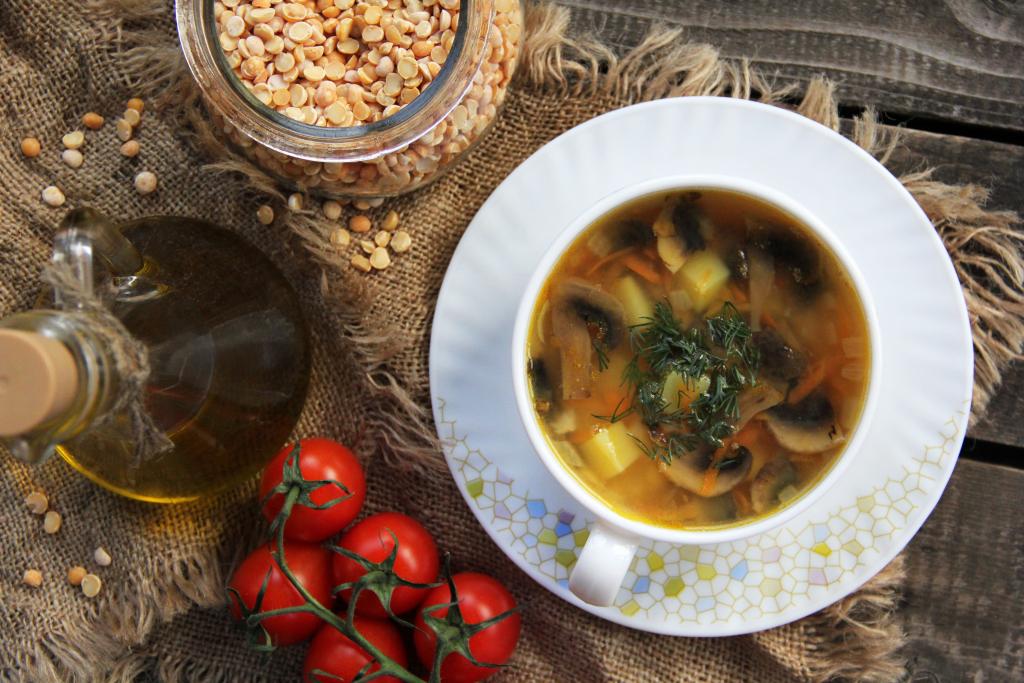 Подать вкусный и ароматный гороховый суп с шампиньонами к столу. По желанию, перед подачей можно добавить рубленную зелень.