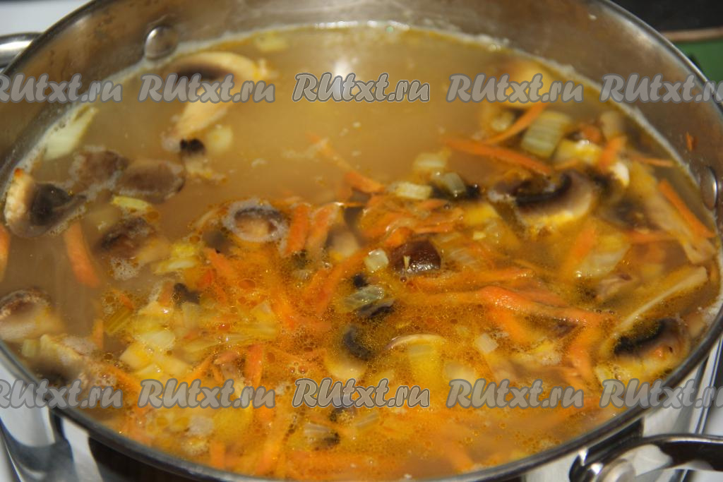 Обжаренные шампиньоны, морковку и лук выложить в гороховый суп, варить 10 минут, затем посолить и поперчить. Выключить огонь, накрыть крышкой и дать настояться в течение 15 минут.
