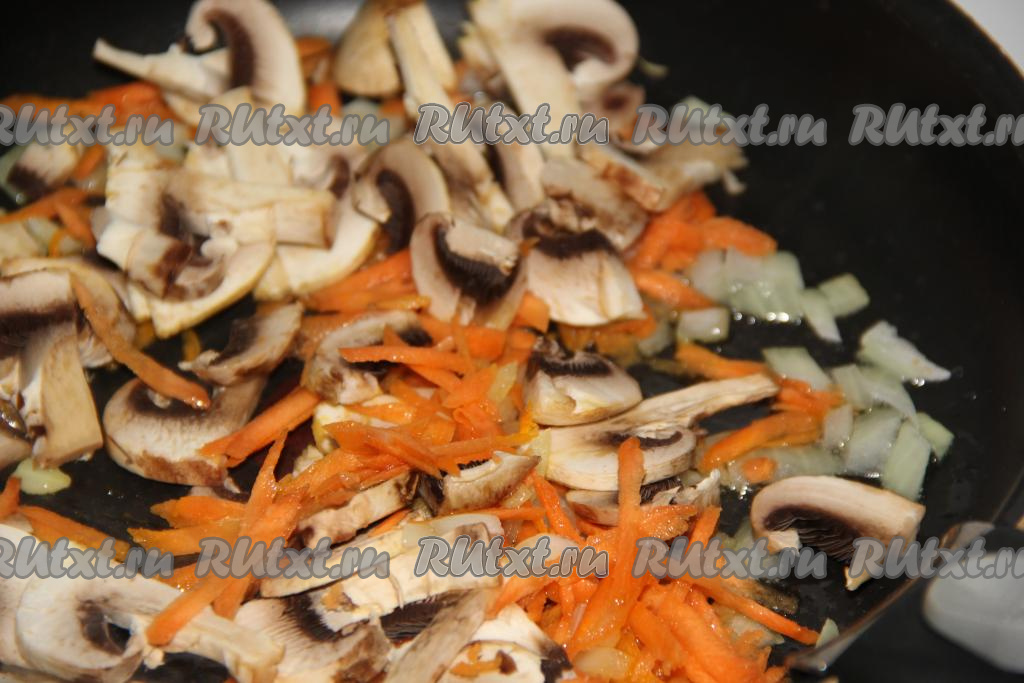 Добавить грибы в сковороду с морковкой и луком, обжаривать шампиньоны с овощами в течение 10 минут, иногда перемешивая.
