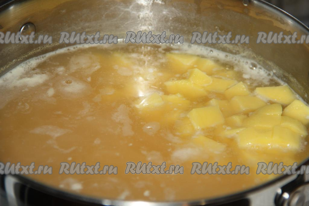 Как только горох будет готов (станет мягким), добавить картофель, варить минут 10 на небольшом огне.