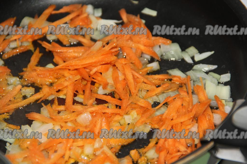 Добавить морковь в сковороду к луку и обжаривать овощи, помешивая, еще 5 минут.