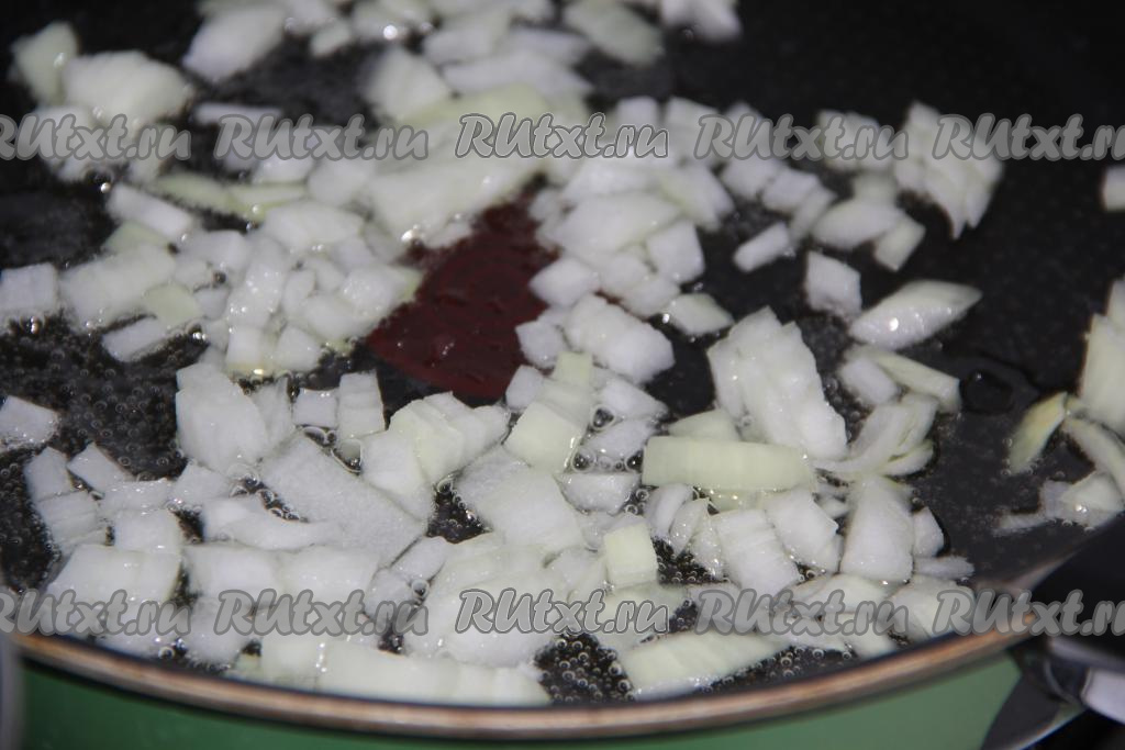 Репчатый лук очистить и мелко нарезать. Выложить лук на сковороду с добавлением растительного масла и обжарить на среднем огне пару минут, помешивая.