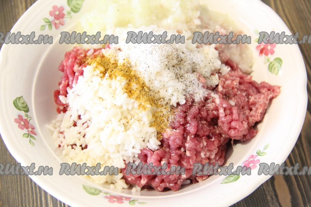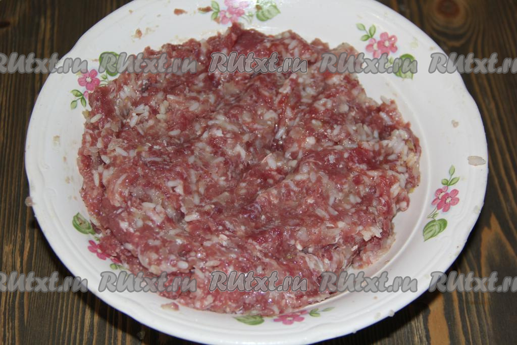 Добавить рис к фаршу и луку. Посолить и приправить специями фарш, можно еще положить рубленную зелень (кинзу, петрушку), я не добавляла.