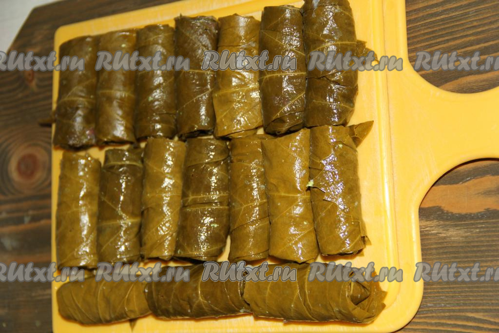 Кастрюлю для приготовления долмы выстелить листьями винограда.