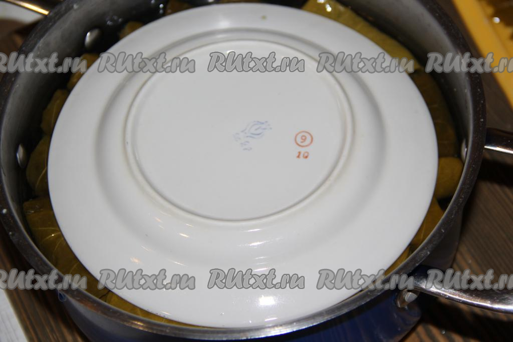 Влить в кастрюлю воду и накрыть тарелкой донышком вверх. Слегка надавить, вода должна полностью покрыть долму. Накрыть кастрюлю крышкой и варить долму с момента закипания минут 50. Огонь после закипания нужно убавить и томить долму под крышкой.