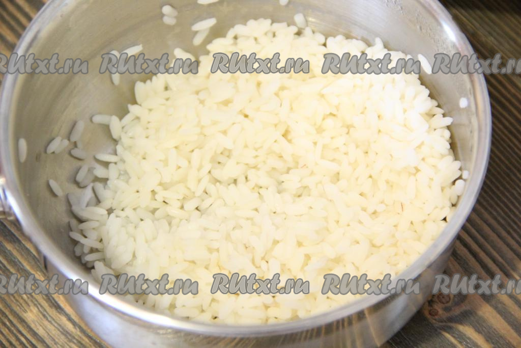 Рис промыть, залить водой и отварить до полуготовности. Откинуть рис на дуршлаг и дать стечь воде.