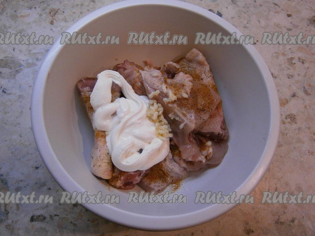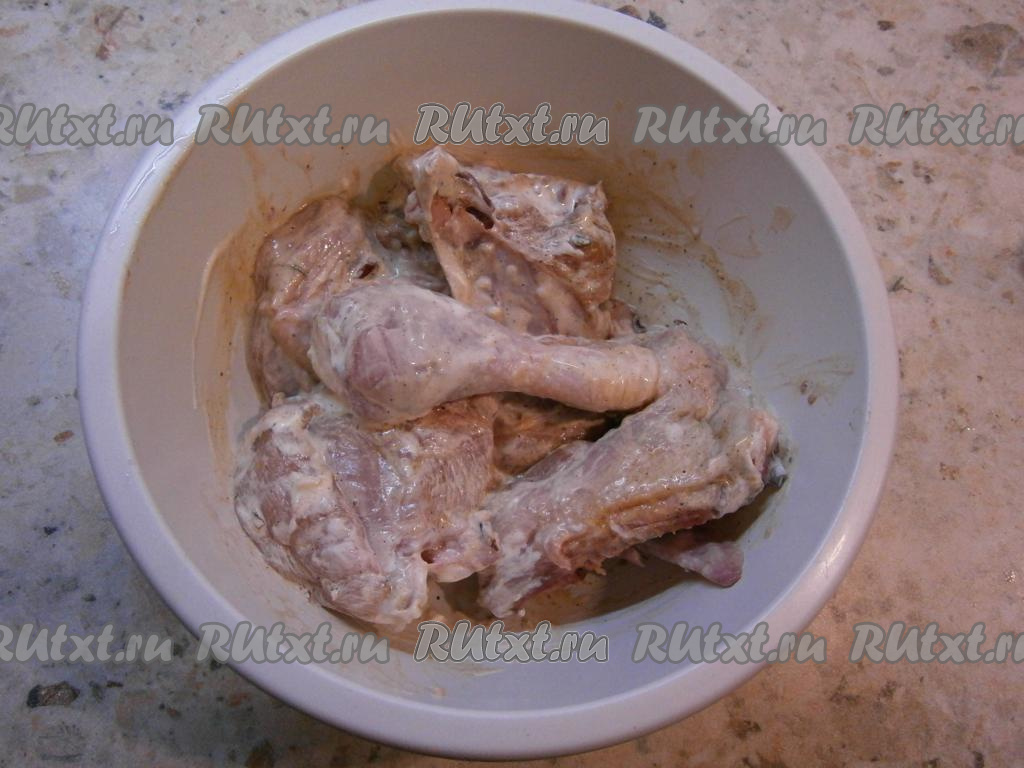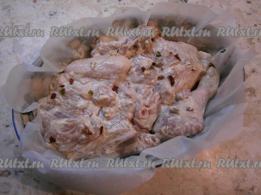 Курицу нарезать на части, посолить и посыпать специями.
