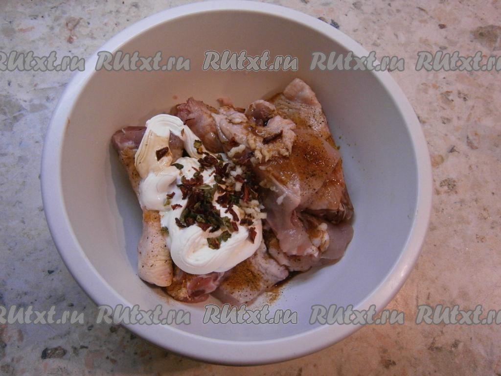 Добавить к курице чеснок, пропущенный через пресс, и сметану.